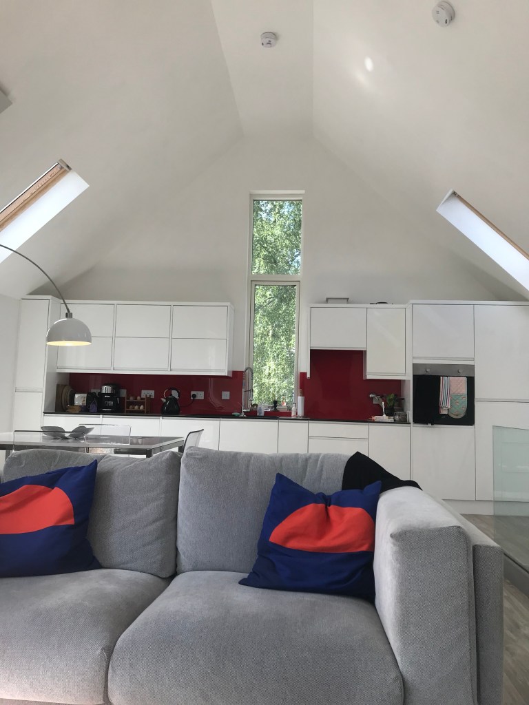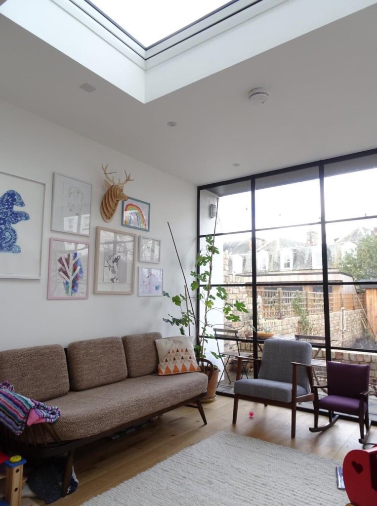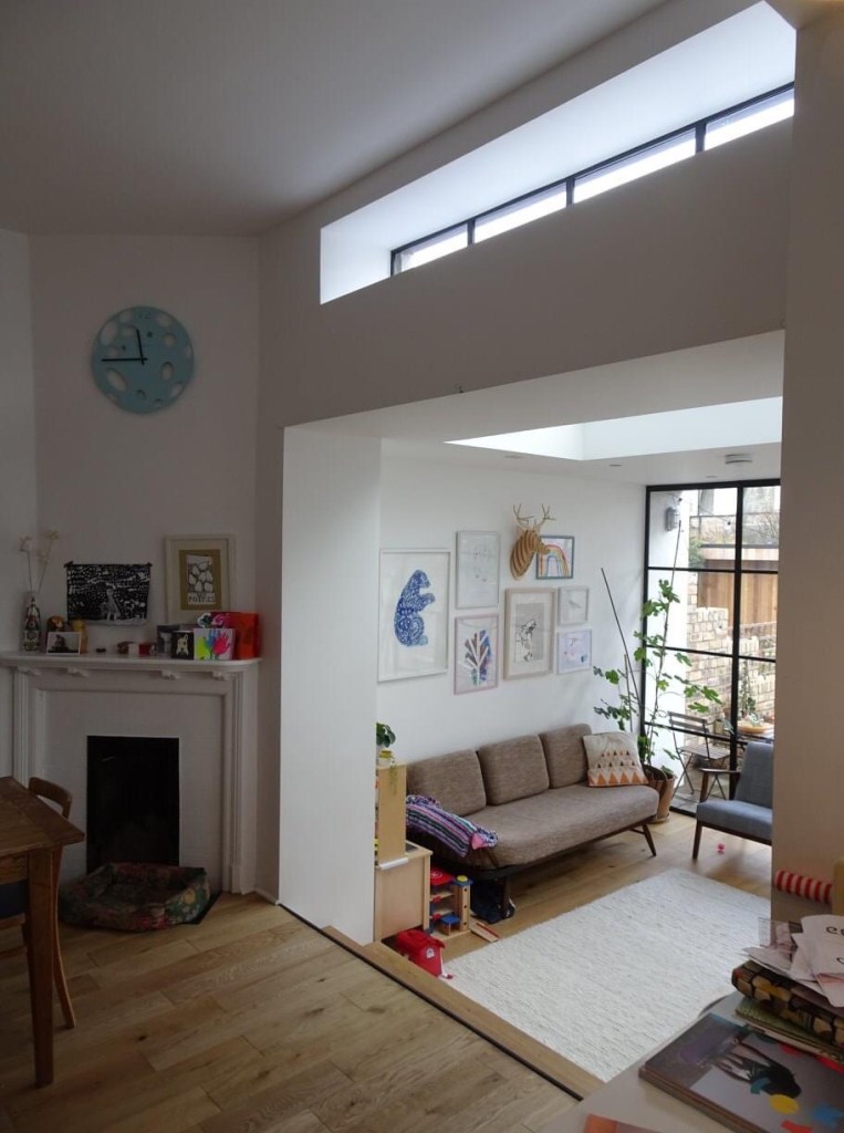 The internal space was linked to the Dining/Kitchen space to form a stepped family hub, additional features were the addition of high level “slot” windows located just below ceiling level which provide a filtering of light at differing times of the day, bathing a previously dark space in light.