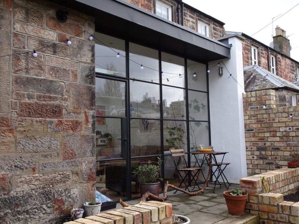A bright spacious contemporary live/work accommodation was achieved by the use of an extruded black zinc dormer complimented by double glazed new crittal windows with narrow board larch cladding integrating it into the roofscape forming a private office level, at ground floor a clean + simple flat roof extension benefiting form matching black zinc fascias linking again with crittal windows + natural stone.