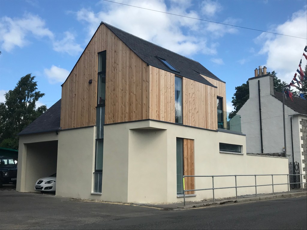 A contemporary low energy, accessible dwelling house formed within a former walled garden formed to nestle into the existing streetscape. Due to our clients limited mobility the dwelling had to be designed to allow for full accessibility without this being obvious, as the site was surrounded on 3 sides with mature trees + a public road to the 4th the use + deflection of light into the dwelling was paramount.