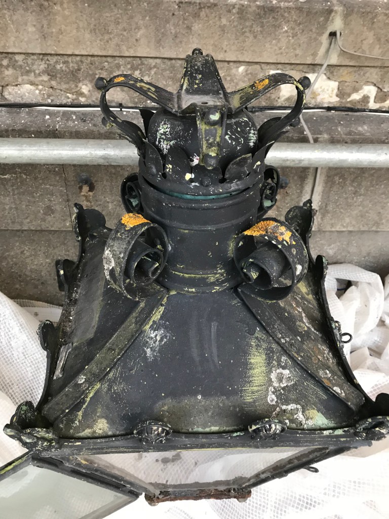 Following assessment + record surveying, a conservation plan was made for the lamp allowing it to be stripped back, exposing all of its original features including cast brasswork, replacement glass which now sports the town crest to the front section + the Selkirk merchant Company crest to either side sections has been fitted + small section such as finials which have been lost in time re-installed. The original bracket has been removed + replaced with a new period style scrolled single bracket which better matches the style of lamp. All electrical supplies were replaced + concealed within the frame + reflective canopy fitted internally.