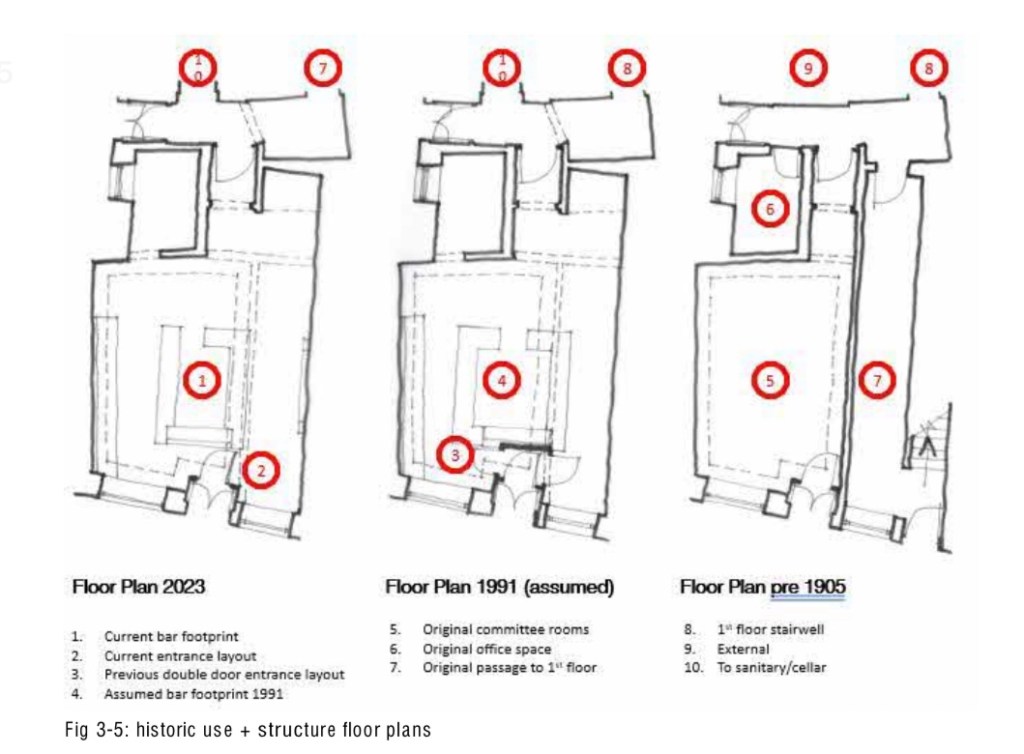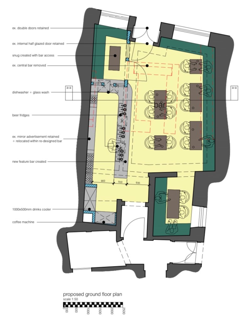 The regeneration of the public house internal layout had to be carefully balanced + assessed against the historic + socially important features within the building. A detailed conservation report was prepared by ourselves charting the buildings history, varied uses + categorising all elements within the property to ensure that any changes were either historically relevant + maintaining all features, whilst ensuring the long term economic viability of the business.
